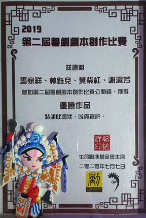 In the past few years, I started learning to write Cantonese opera drama scripts. In 2019, a writing project I took part in won a prize in a competition: