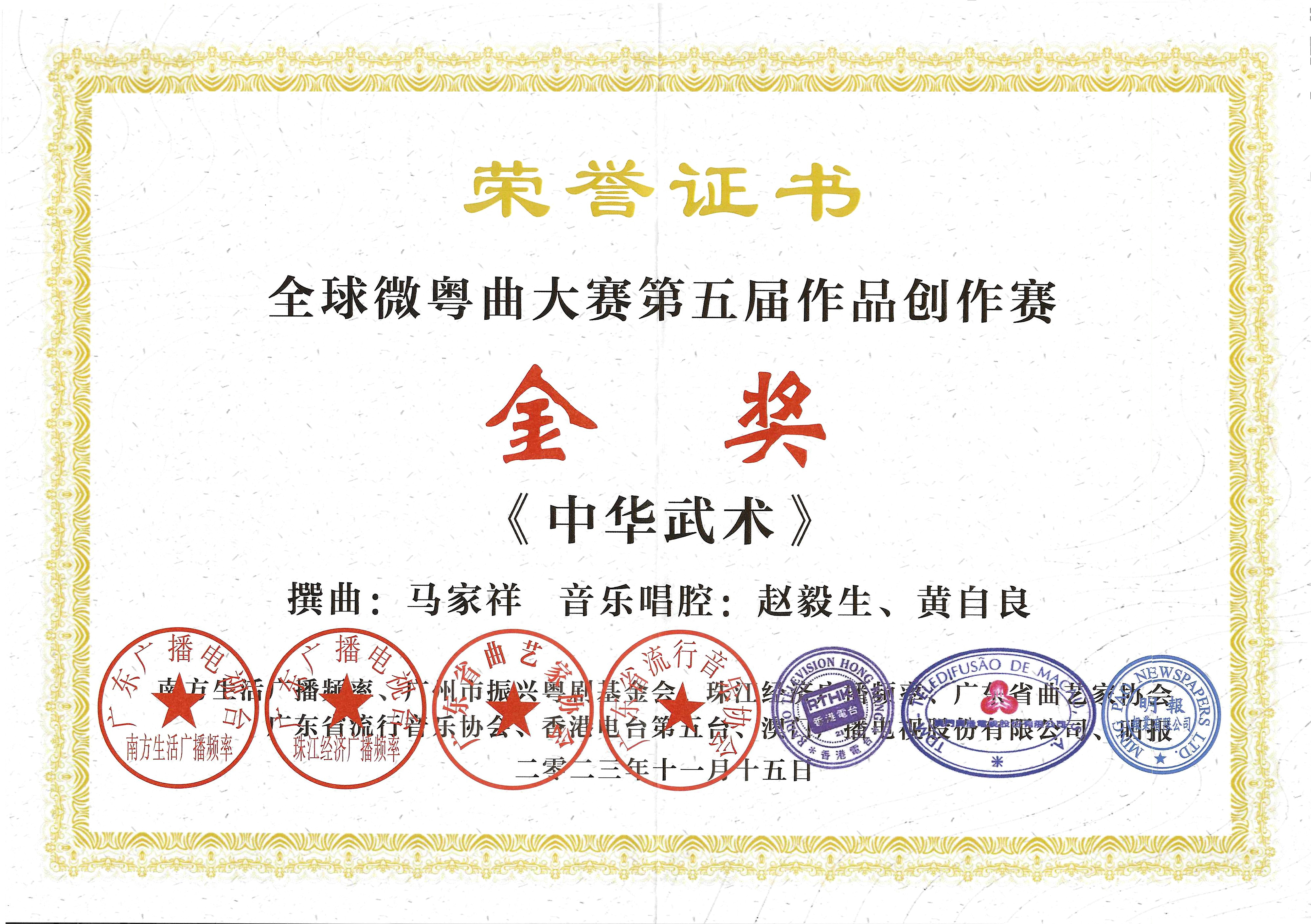 In 2023, another mini-Cantonese operatic song I wrote《中華武術》榮獲金曲獎 at the 5th Worldwide Mini-Cantonese Operatic Song Writing Competition「全球微粵曲大賽第五屆作品創作賽」.