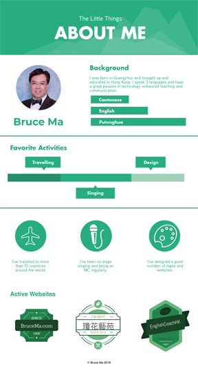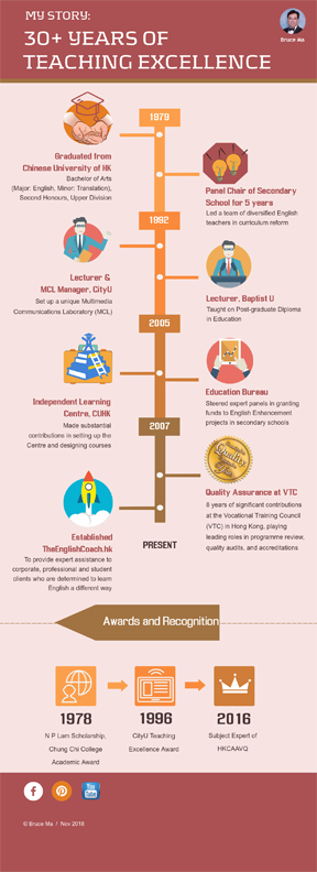 I am a middle-class professional in the field of Education and Teaching English as a Second Language. Born in Guangzhou and brought up in Hong Kong, I hold a BA in English Language and Literature, a Diploma in Education and an MA in TESL. I am keen on using technology in my profession, for communication, for enhancing communication, and for improving teaching or work processes. I worked in a local secondary school as English Panel Chairperson for five years before joining Vocational Training Council (VTC) as Lecturer. After that, I worked with City University of Hong Kong, as Lecturer and Multimedia Communication Laboratory Manager, for 12 years. I re-joined the VTC in June 2007 and worked for 2 contracts of 8 eights in its Quality Assurance and Accreditation Office.