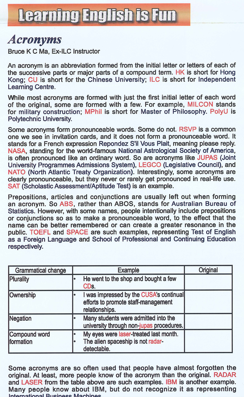 Acronyms. University Marketplace, 135, September, 2007, the Chinese University of Hong Kong |