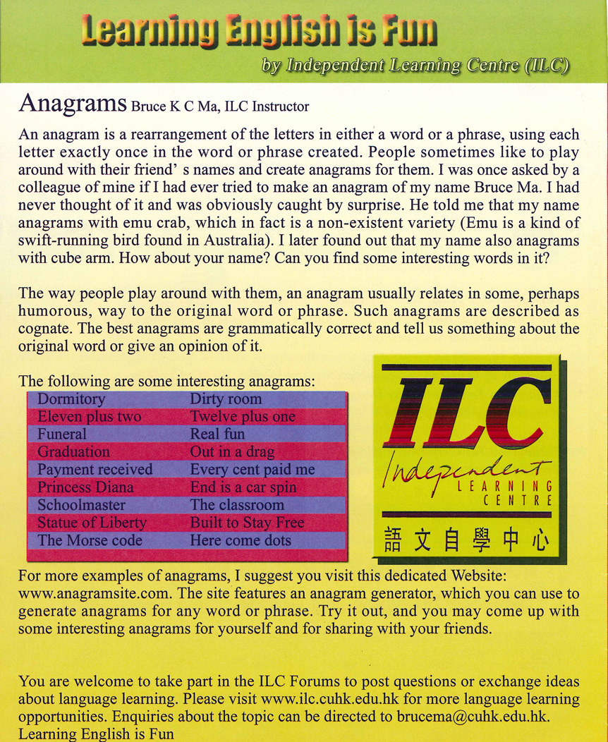 Anagrams. University Marketplace, 125, February, 2006, the Chinese University of Hong Kong. |