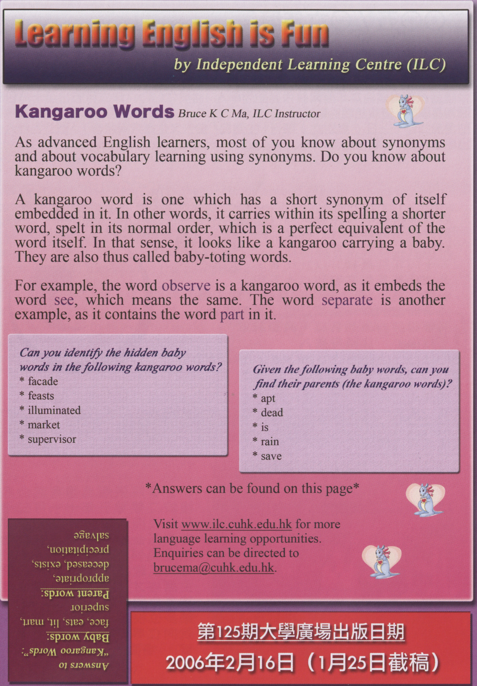 Kangaroo words. University Marketplace, 124, January, 2006, the Chinese University of Hong Kong. |