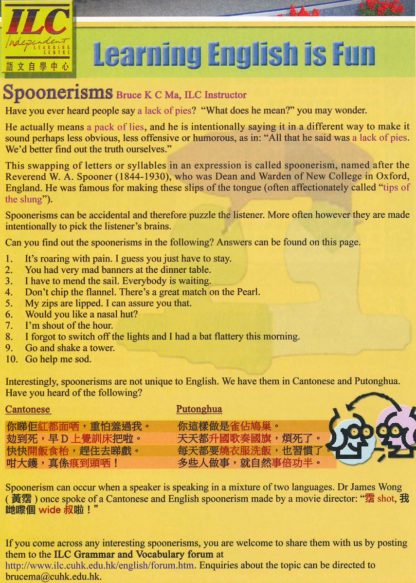 Spoonerisms. University Marketplace, 127, April, 2006, the Chinese University of Hong Kong. |